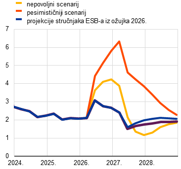 Osim osnovnih projekcija, stručnjaci ESB‑a sastavili su alternativne, hipotetske scenarije koji sadržavaju različite pretpostavke o opsegu i trajanju šoka cijena energije, njegovu utjecaju na međunarodno okružje i neizvjesnost te širenju neizravnim učincima i drugim krugom učinaka na inflaciju. Ti su scenariji ilustrativni primjeri alternativnih kretanja cijena energenata i njihova prijenosa na gospodarstvo europodručja. Stručnjaci tim scenarijima ne dodjeljuju vjerojatnost, oni služe za isticanje glavnih aspekata neizvjesnosti u vezi s utjecajem sukoba. Kao što je uobičajeno u projekcijama, tim se scenarijima ilustriraju učinci na gospodarstvo europodručja u slučaju izostanka mjera monetarne ili fiskalne politike koje nisu uključene u osnovni scenarij. Nepovoljni scenarij uključuje snažnije neizravne učinke i učinke u drugom krugu u odnosu na osnovni scenarij kako bi se obuhvatile moguće nelinearnosti u širenju početnog šoka cijena energije na druge cijene u cijelom gospodarstvu. U njemu se pretpostavlja znatno snažniji porast cijena energije, povećanje neizvjesnosti te nepovoljnih učinaka prelijevanja na međunarodna tržišta (primjerice, smanjenje inozemne potražnje). Pretpostavlja se da će cijene nafte i plina dosegnuti najvišu razinu od 119 USD po barelu odnosno 87 EUR po megavatsatu u drugom tromjesečju 2026., ali će do trećeg tromjesečja 2027. doći na razine pretpostavki u osnovnom scenariju. U odnosu na osnovni scenarij, u nepovoljnom bi scenariju inflacija bila viša za 0,9 postotnih bodova u 2026. i za 0,1 postotni bod u 2027., ali niža za 0,5 postotnih bodova u 2028. zbog dezinflacijskih pritisaka koji bi proizišli iz brze normalizacije cijena energije u toj godini. Nasuprot tomu, gospodarski rast bio bi niži u 2026. i 2027. nego u osnovnom scenariju, ali viši u 2028. U odnosu na nepovoljni scenarij, u pesimističnijem scenariju pretpostavlja se snažniji i dugotrajniji šok cijena energije, veća neizvjesnost te još snažniji neizravni učinci i učinci u drugom krugu. Pretpostavlja se da će cijene nafte i plina dosegnuti najvišu razinu od 145 USD po barelu odnosno 106 EUR po megavatsatu u drugom tromjesečju 2026. i potom znatno sporije padati te da će se u preostalom dijelu projekcijskog razdoblja zadržati na razinama koje su znatno više od pretpostavki iz osnovnog i nepovoljnog scenarija. U odnosu na osnovni scenarij ukupna inflacija bila bi znatno i dugotrajnije viša tijekom projekcijskog razdoblja (za 1,8 postotnih bodova u 2026., 2,8 postotnih bodova u 2027. i 0,7 postotnih bodova u 2028.). Iz znatne razlike u inflaciji u 2028. između nepovoljnog scenarija (1,6 %) i pesimističnijeg scenarija (2,8 %), kako je prikazano u Tablici 1., vidljivo je koliko su razvoj sukoba, poremećaji opskrbe energijom i veličina mehanizama širenja pokrenutih šokom važni za određivanje učinka na inflaciju u srednjoročnom razdoblju. Gospodarski rast bio bi za 0,4 do 0,5 postotnih bodova niži u 2026. i 2027. te bi se u 2028. trebao povećati na razinu koja je za 0,5 postotnih bodova viša od one u osnovnom scenariju. Povećanje rasta pred kraj projekcijskog razdoblja posljedica je pretpostavljenog rasta dohodaka i potražnje koji proizlazi iz usklađivanja plaća s rastom inflacije prethodnih godina.