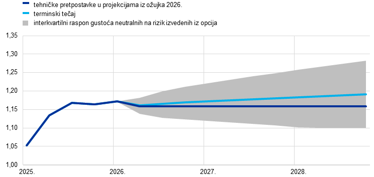 Kao krajnji datum za tehničke pretpostavke određen je 11. ožujka 2026., dva dana prije dovršetka projekcija i neuobičajeno blizu sastanka Upravnog vijeća povezanog s monetarnom politikom, zbog izvanrednih geopolitičkih kretanja i potrebe uključivanja informacija o situaciji koja se brzo mijenja. Pretpostavke se temelje na prosjeku tržišnih podataka tijekom triju dana koji su prethodili krajnjem datumu. Obično se u projekcijama rabi desetodnevno razdoblje. Trodnevno, kraće razdoblje znači da su uzeti u obzir samo podatci za razdoblje nakon izbijanja rata na Bliskom istoku. Projekcije za međunarodno okružje dovršene su 11. ožujka a projekcije za europodručje dovršene su 13. ožujka 2026. Zbog ograničenog vremena za dovršetak projekcija nije bilo moguće izraditi neke od detaljnih varijabli koje se obično navode u projekcijama.