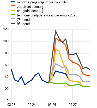 Sklop projekcij, ki temeljijo na tehničnih predpostavkah s presečnim datumom na dan 4. marca (v katere so vključene informacije prvih treh delovnih dni po začetku vojne na Bližnjem vzhodu), odraža ugodnejše obete, saj se predpostavlja, da bodo cene nafte in plina v drugem četrtletju 2026 dosegle najvišjo vrednost na ravni 79 USD za sod oziroma 48 EUR/MWh.[2] Po teh projekcijah bi bila inflacija v letu 2026 za 0,3 odstotne točke nižja od končnih osnovnih projekcij in v letih 2027 in 2028 za 0,1 odstotne točke, medtem ko bi bila rast v vsakem letu obdobja projekcij višja za 0,1 odstotne točke.