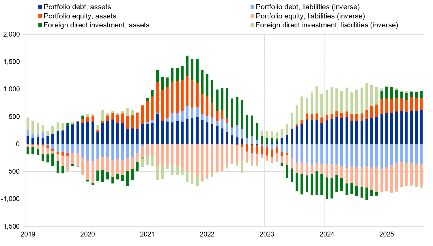 - In financial account, euro area residents’ net acquisitions of non-euro area portfolio investment securities totalled €848 billion and non-residents’ net acquisitions of euro area portfolio investment securities totalled €745 billion in the 12 months to August 2025