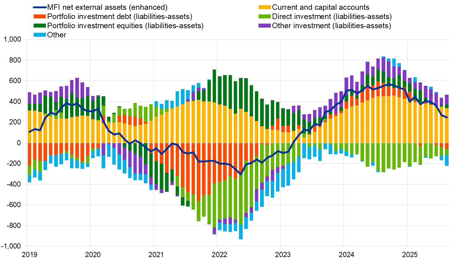 The monetary presentation of the balance of payments (Chart 3) shows that the net external assets (enhanced) of euro area MFIs increased by €245 billion in the 12 months to August 2025. This increase was driven by the current and capital accounts surplus and euro area non-MFIs’ net inflows in other investment and portfolio investment equity. These developments were partly offset by euro area non-MFIs’ net outflows in other flows, direct investment and portfolio investment debt.