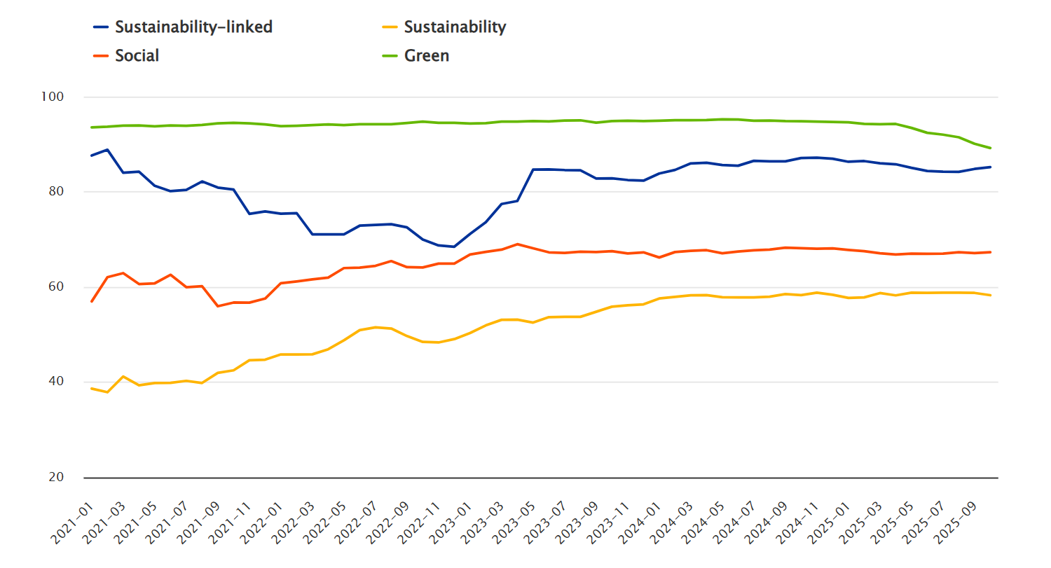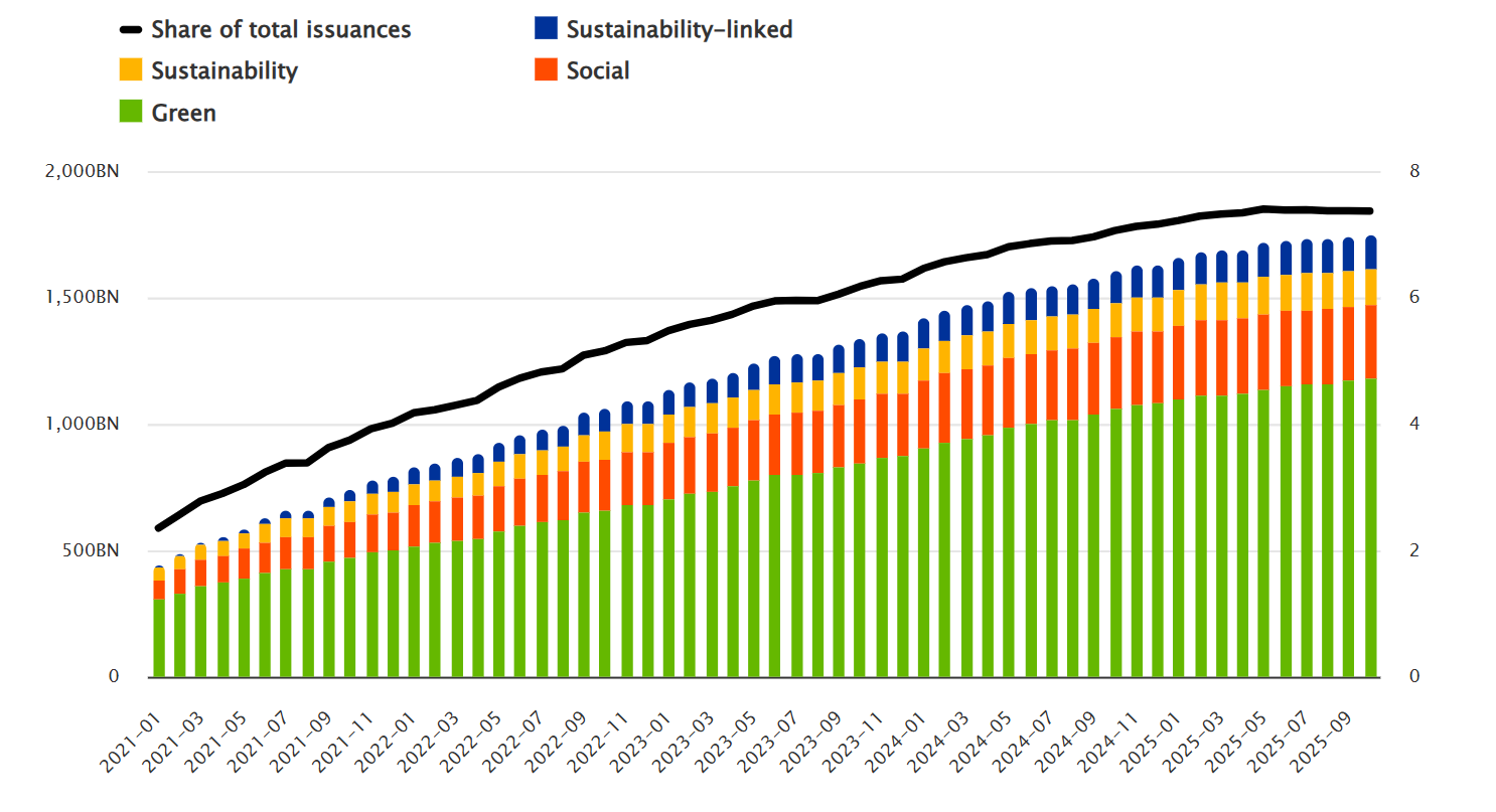 This latest update, released in November 2025, further expands the scope of the indicators with new aggregates on sustainable debt securities issuances. These aggregates provide breakdowns by original maturity, currency of denomination and interest rate type, offering a more granular view of the market. In doing so, the new breakdowns also address the reporting requirements in the context of the G20 Data Gaps Initiative Recommendation 4 on Climate Finance, supporting the availability of comparable data on sustainable finance across the G20 economies.