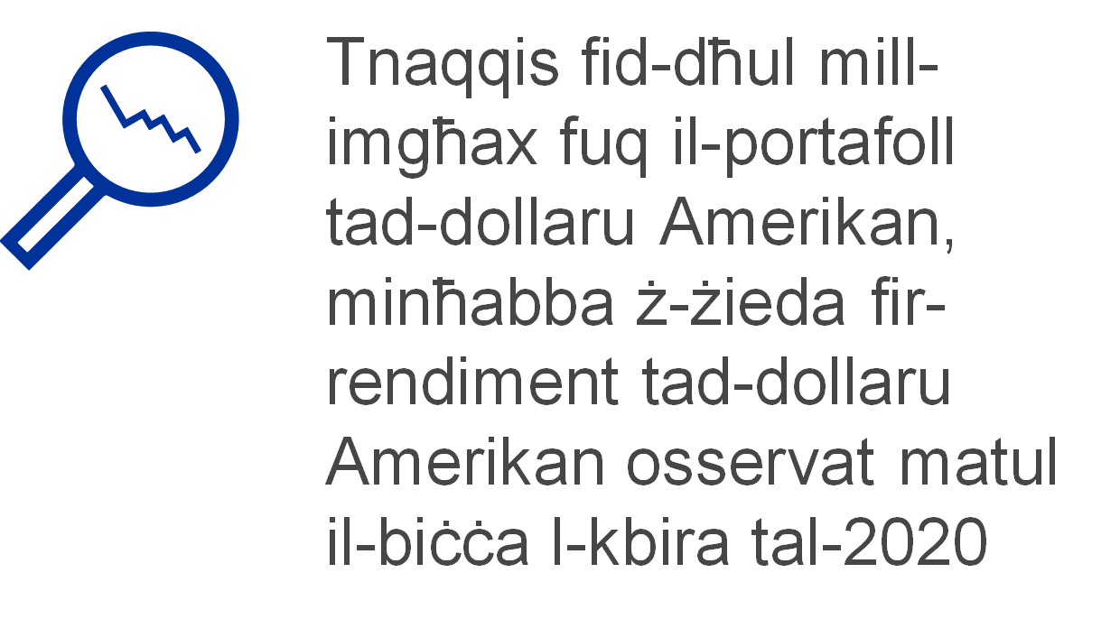 Id-dħul mill-imgħax nett fuq assi f’riżervi barranin naqas minn €577 miljun għal €474 miljun, l-aktar minħabba t-tnaqqis fid-dħul mill-imgħax fuq titoli denominati f’dollari Amerikani. Minħabba x-xejra li qed tonqos fir-rendiment ta’ titoli f’dollari Amerikani matul il-biċċa l-kbira tal-2019 u l-2020 (Ċart 15), b’mod partikolari għal maturitajiet qosra, il-BĊE akkwista titoli b’rendimenti aktar baxxi, u b’hekk naqqas ir-rendiment medju tal-portafoll tad-dollaru Amerikan meta mqabbel mas-sena ta’ qabel. Dan kellu impatt negattiv fuq id-dħul mill-imgħax li nkiseb fuq dan il-portafoll matul l-2020.