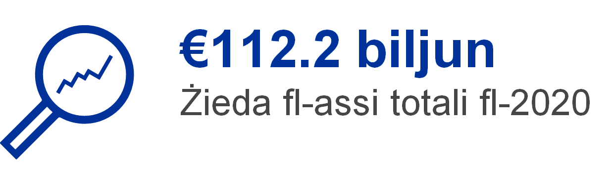 Fl-2020 l-assi totali tal-BĊE żdiedu b’€112.2 biljun għal €569.3 biljun, l-aktar minħabba s-sehem tiegħu fix-xiri ta’ titoli fil-programm ta’ xiri għall-emerġenza pandemika (PEPP)[6] u l-APP. Dan ix-xiri rriżulta f’żieda fit-“Titoli miżmuma għall-għanijiet tal-politika monetarja”, waqt li l-ħlas bi flus kontanti għal dan ix-xiri permezz tal-kontijiet tat-TARGET2 wassal għal żieda korrispondenti fl-“Obbligazzjonijiet fi ħdan l-Eurosistema”. Iż-żieda fil-valur tal-karti tal-flus tal-euro fiċ-ċirkolazzjoni kkontribwixxiet ukoll għal din iż-żieda.