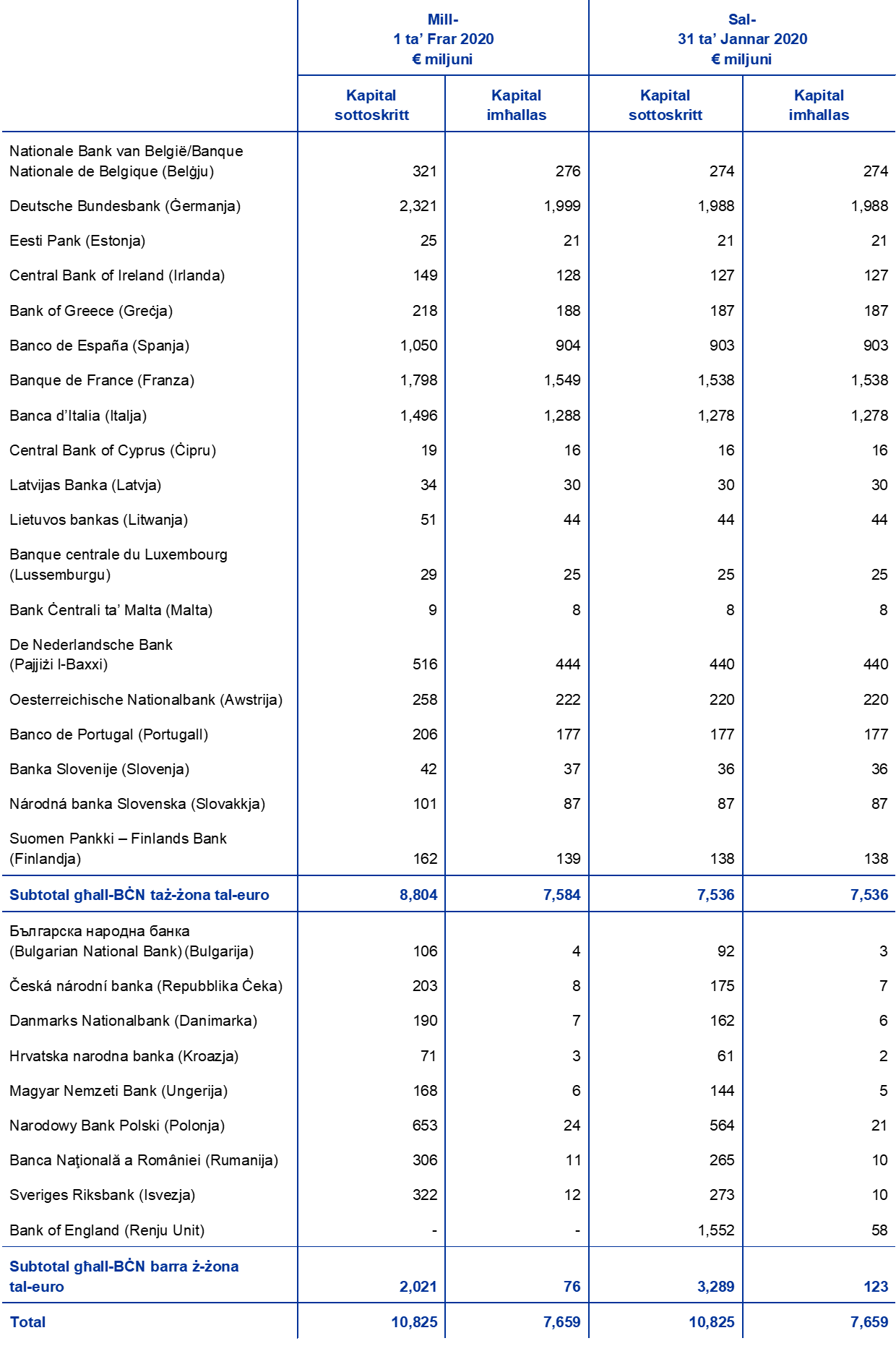 Minkejja t-tluq tal-Bank of England mis-Sistema Ewropea ta’ Banek Ċentrali (SEBĊ), il-kapital tal-BĊE mħallas mill-BĊN taż-żona tal-euro u mhux taż-żona tal-euro baqa’ l-istess fl-2020 f’€7.7 biljun, minħabba li l-BĊN li fadal koprew il-kapital imħallas ta’ €58 miljun tal-Bank of England li rtira. Il-kapital imħallas totali tal-BĊE se jiżdied minn €7.7 biljun fl-2020 għal €8.9 biljun fl-2022, peress li l-ishma tal-BĊN taż-żona tal-euro fil-kapital sottoskritt tal-BĊE żdiedu wara l-irtirar tal-Bank of England mis-SEBĊ u se jitħallas kollu f’żewġ pagamenti annwali ta’ madwar €0.6 biljun kull wieħed fl-2021 u l-2022[15]