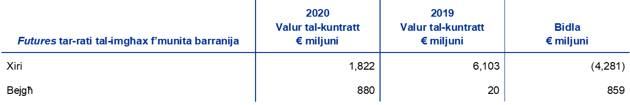 Fl-2020 il-valur totali ekwivalenti f’euro tal-assi tal-BĊE f’riżervi barranin, li jikkonsistu f’deheb, drittijiet speċjali ta’ ġbid, dollari Amerikani, yen Ġappuniż u renminbi Ċiniż, baqgħu prattikament l-istess f’€75.8 biljun.