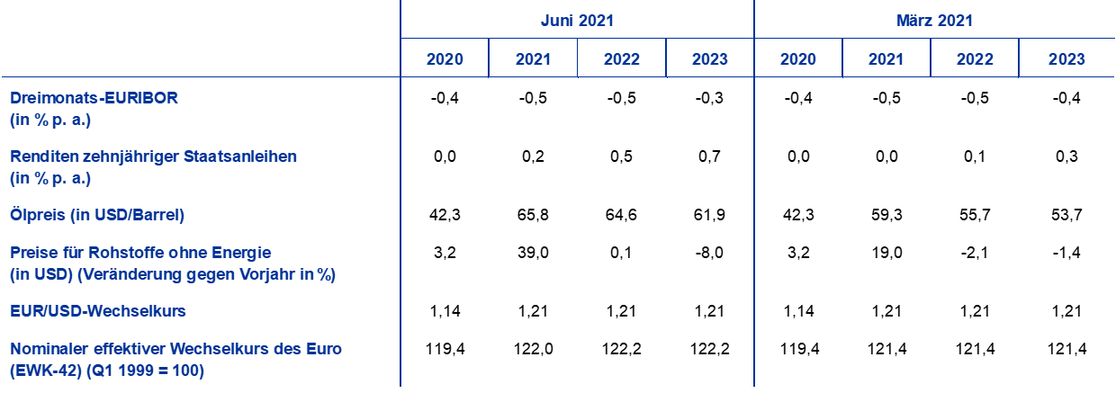 Gegenüber den Projektionen vom März 2021 enthalten die aktuellen technischen Annahmen höhere langfristige Zinssätze, wesentlich höhere Ölpreise und einen etwas stärkeren effektiven Euro-Wechselkurs. Die technischen Annahmen zu den Zinssätzen und Rohstoffpreisen beruhen auf den Markterwartungen; Redaktionsschluss war der 18. Mai 2021. Die Kurzfristzinsen beziehen sich auf den Dreimonats-EURIBOR, wobei die Markterwartungen von der Entwicklung der Terminkontrakte abgeleitet werden. Bei Anwendung dieser Methode ergibt sich für die Kurzfristzinsen ein Durchschnittsniveau von -0,5 % in den Jahren 2021 und 2022 sowie von -0,3% im Jahr 2023. Die Markterwartungen bezüglich der nominalen Renditen zehnjähriger Staatsanleihen im Eurogebiet implizieren ein durchschnittliches jährliches Niveau von 0,2% im Jahr 2021, 0,5% im Jahr 2022 und 0,7% im Jahr 2023.[4] Gegenüber den Projektionen vom März 2021 wurden die Markterwartungen hinsichtlich des Niveaus der Kurzfristzinsen für 2023 geringfügig angehoben. Die Markterwartungen bezüglich der nominalen Renditen zehnjähriger Staatsanleihen im Euroraum für den Zeitraum von 2021 bis 2023 haben sich um etwa 20 bis 40 Basispunkte erhöht.