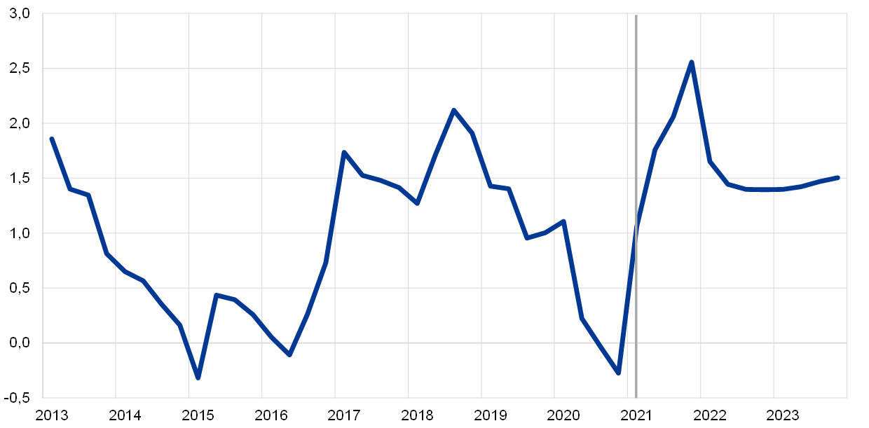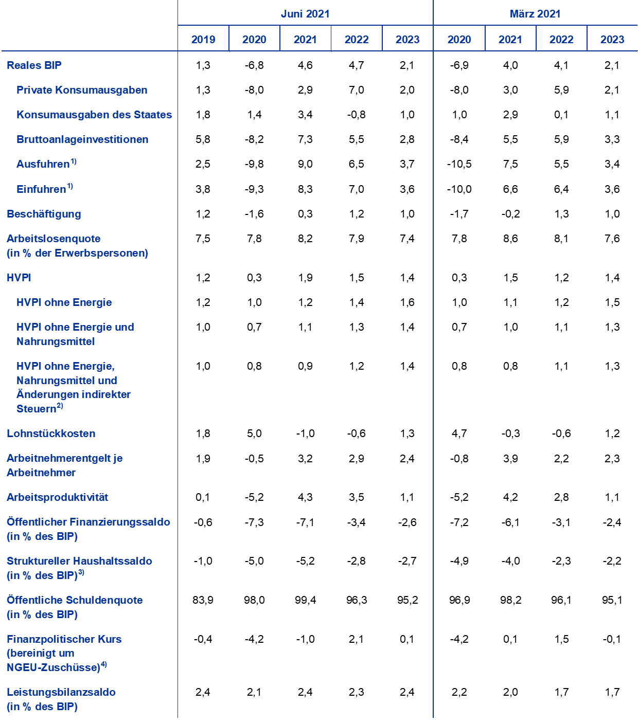 Anmerkung: Die Daten sind saison- und arbeitstäglich bereinigt. Aufgrund von Daten, die erst nach dem Redaktionsschluss für die Projektionen veröffentlicht wurden, können historische Daten von den jüngsten Eurostat-Veröffentlichungen abweichen. Die vertikale Linie markiert den Beginn des Projektionszeitraums der Projektionen vom Juni 2021.