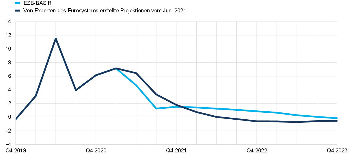 Anmerkung: Beide Linien zeigen die Abweichung gegenüber der in den Projektionen vom Dezember 2019 prognostizierten Sparquote. Die besagten Projektionen wurden als Referenzgröße für die Entwicklung vor der Pandemie gewählt. Die Projektionen vom Dezember 2019 werden bis 2023 ausgeweitet. Dabei werden die durchschnittlichen Wachstumsraten für das nominale verfügbare Einkommen und die privaten Konsumausgaben ab dem Jahr 2022 verwendet. Für das BASIR-Modell der EZB werden die Projektionen vom Juni 2021 auf das erste Quartal 2021 angewandt.