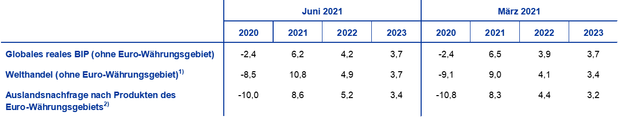 Trotz der Aufwärtskorrektur in den Vereinigten Staaten haben sich die Wachstumsaussichten für die Weltwirtschaft im Vergleich zu den Projektionen vom März 2021 kaum verändert. Die Projektionen für den Welthandel haben sich hingegen leicht verbessert. Das globale BIP (ohne Euroraum) dürfte 2021 um 6,2 % steigen, bevor sich das Wachstum 2022 und 2023 auf 4,2 % bzw. 3,7 % abschwächt. Dies spiegelt ein Zusammenspiel von Faktoren wider, darunter eine Verschlechterung der Pandemielage in den fortgeschrittenen Volkswirtschaften zu Jahresbeginn und in den Schwellenländern in jüngerer Zeit[12] sowie die makroökonomischen Auswirkungen des großen Konjunkturpakets in den Vereinigten Staaten und sich verbessernde Aussichten in anderen fortgeschrittenen Volkswirtschaften aufgrund der raschen Bereitstellung von Impfstoffen. Obwohl die globale Wirtschaftstätigkeit Ende 2020 über dem Niveau vor der Pandemie lag, wird davon ausgegangen, dass sie über den Projektionszeitraum hinweg hinter der in den Projektionen vom Dezember 2019 erwarteten Entwicklung zurückbleiben wird.