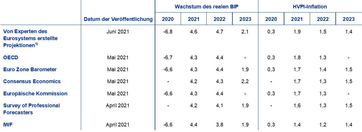 Die Projektionen vom Juni 2021 sind optimistischer als andere Wachstums- und Inflationsprognosen für 2021 und 2022 und entsprechen weitgehend den Prognosen für 2023. Betrachtet man die Prognosen anderer Institutionen und privatwirtschaftlicher Organisationen, so schwankt die Veränderung des realen BIP im Jahr 2022 gegenüber 2019 zwischen 1,2 % (Prognose des IWF) und 1,7 % (Prognose der Europäischen Kommission). Der diesbezügliche Wert in den Projektionen des Eurosystems vom Juni 2021 fällt mit 2,1 % deutlich höher aus. Was die Inflation betrifft, so sind die Projektionen vom Juni 2021 sowohl für dieses Jahr als auch für 2022 höher. Dies ist vor allem auf die höhere erwartete Inflation bei den volatileren Komponenten zurückzuführen. Für 2023 stehen die Projektionen mit denen des IWF im Einklang und liegen leicht unterhalb anderer Prognosen.