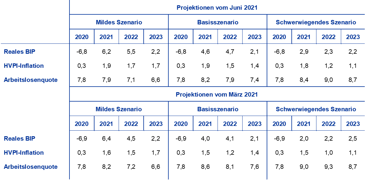 Im Vergleich zu den Projektionen vom März 2021 wurde das Wachstum des realen BIP für 2021 und 2022 nach oben korrigiert. Die Aufwärtskorrektur des Wachstums für das zweite Halbjahr 2021 betrifft vor allem das dritte Quartal. Dies spiegelt die Erwartung einer rascheren Lockerung von Eindämmungsmaßnahmen wider. Diese steht im Zusammenhang mit zunehmenden Fortschritten bei den Impfungen, zusätzlicher finanzieller Unterstützung und einer Neubewertung der Auswirkungen, die die Auflösung der aufgestauten Binnennachfrage nach dem Wiederhochfahren der Wirtschaftssektoren haben dürfte. Dies erklärt den Großteil der Änderungen des Jahreswachstums für 2021 und insbesondere für 2022, wobei Letztere ausschließlich auf Überhangeffekte zurückzuführen sind. Die Auswirkungen der Annahmen sind weitgehend neutral, da die positiven Effekte auf das Wachstum, getragen durch die Erwartung einer stärkeren Auslandsnachfrage, größtenteils durch die negativen Auswirkungen höherer Ölpreise sowie der Rücknahme zusätzlicher, aber befristeter finanzieller Unterstützungsmaßnahmen über das laufende Jahr hinaus ausgeglichen werden.
