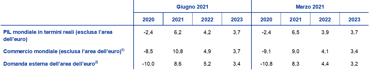 Nonostante la revisione al rialzo negli Stati Uniti, le prospettive per la crescita dell’economia mondiale non presentano variazioni di rilievo nel confronto con l’esercizio dello scorso marzo, mentre le proiezioni per il commercio internazionale hanno registrato un lieve miglioramento. La crescita del PIL mondiale (esclusa l’area dell’euro) sarebbe pari al 6,2% quest’anno, per poi scendere al 4,2% e al 3,7%, rispettivamente, nel 2022 e nel 2023. Ciò riflette l’interazione tra diversi fattori, compreso il peggioramento della pandemia nelle economie avanzate agli inizi di quest’anno e in quelle emergenti nel periodo più recente[12], oltre che l’impatto macroeconomico dell’ampio stimolo fiscale negli Stati Uniti e il miglioramento delle prospettive nelle altre economie avanzate grazie alla rapida distribuzione dei vaccini. L’attività mondiale, che alla fine del 2020 è salita al di sopra del livello antecedente la pandemia, nell’orizzonte temporale di riferimento rimarrebbe inferiore al profilo atteso nelle proiezioni degli esperti dell’Eurosistema di dicembre 2019.