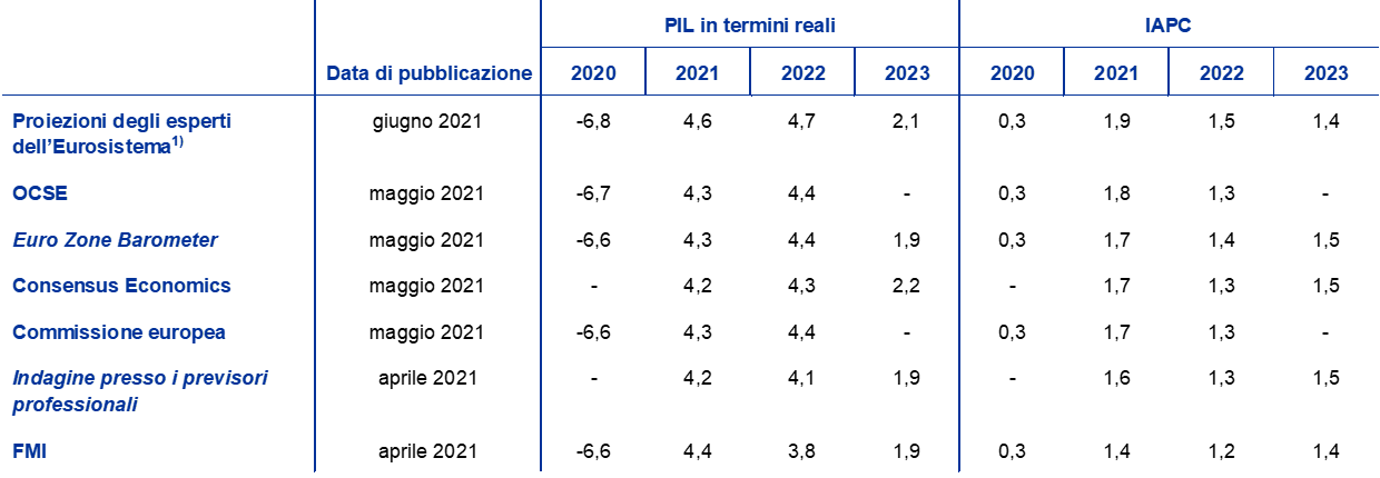 Le proiezioni di giugno degli esperti dell’Eurosistema relative alla crescita e all’inflazione sono più ottimistiche delle altre previsioni per il 2021 e il 2022 e complessivamente in linea per il 2023. Le previsioni delle altre organizzazioni e degli analisti del settore privato per la variazione del PIL in termini reali nel 2022 rispetto al 2019 sono comprese fra l’1,2% dell’FMI e l’1,7% della Commissione europea, mentre le proiezioni formulate dagli esperti dell’Eurosistema nell’esercizio di giugno 2021 si collocano notevolmente al di sopra di tale intervallo al 2,1%. Con riferimento all’inflazione, le proiezioni di giugno degli esperti dell’Eurosistema sono superiori sia per il 2021 sia per il 2022, principalmente a causa dei più elevati tassi di variazione attesi delle componenti maggiormente volatili, mentre per il 2023 sarebbero in linea con quelle dell’FMI e lievemente inferiori alle altre previsioni.
