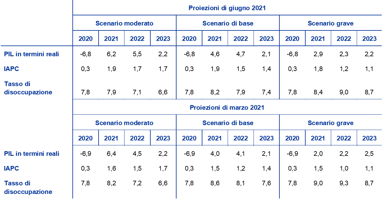 Dato il persistere di un grado notevole di incertezza circa l’evoluzione futura della pandemia di COVID-19 e gli effetti economici della stessa, due scenari che si pongono come alternativi rispetto allo scenario di base delle proiezioni degli esperti dell’Eurosistema di giugno 2021 illustrano un intervallo dei plausibili effetti della pandemia sull’economia dell’area dell’euro.