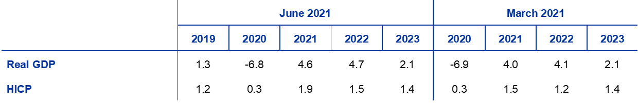 Compared with the March 2021 projections, real GDP growth has been revised up for 2021 and 2022. Growth for the second half of 2021 was revised up, notably in the third quarter. This reflects anticipation of a faster easing of containment measures, linked to accelerating progress in vaccinations, additional fiscal support, and a reassessment of the impact of the release of pent-up domestic demand upon the re-opening of economic sectors. This explains most of the revisions to annual growth for 2021 and in particular for 2022, the latter being entirely due to carry-over effects. The impact of assumptions is broadly neutral as the positive effects on growth, supported by stronger foreign demand assumptions, are largely offset by the negative impact of both higher oil prices and the reversal in additional but temporary fiscal support measures beyond the current year.