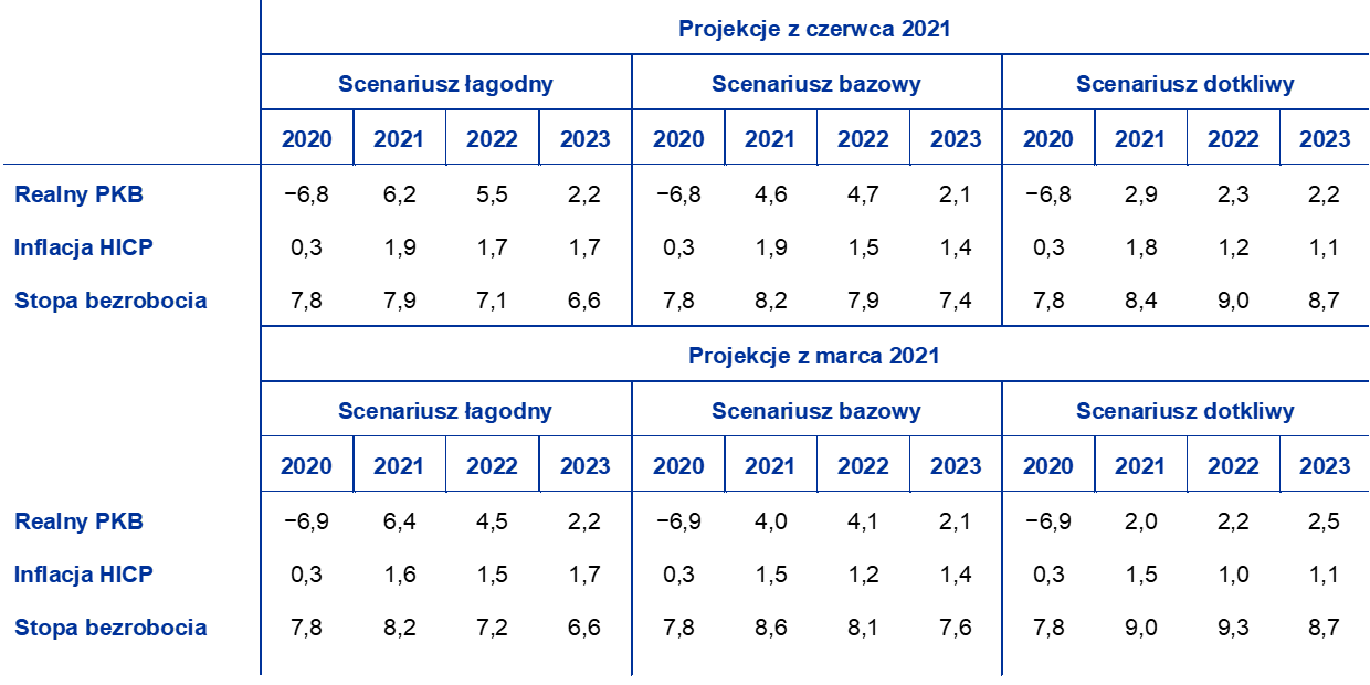Uwagi: Realny PKB i jego składowe, jednostkowe koszty pracy, przeciętne wynagrodzenie i produktywność pracy na podstawie danych odsezonowanych i po wyrównaniu dniami roboczymi. Dane historyczne mogą się różnić od najnowszych danych Eurostatu, których publikacja przypadła po dacie granicznej projekcji. W tabeli nie podano przedziałów wokół projekcji. Wynika to stąd, że w obecnych okolicznościach przedziały obliczone w standardowy sposób (na podstawie historycznych błędów projekcji) nie byłyby wiarygodną miarą podwyższonej niepewności obciążającej bieżące projekcje. Lepiej ją obrazują alternatywne scenariusze oparte na odmiennych założeniach co do przyszłego przebiegu pandemii COVID‑19, środków wprowadzonych w celu jej opanowania oraz rozległości trwałych śladów pozostawionych przez kryzys w gospodarce, przedstawione w punkcie 5.