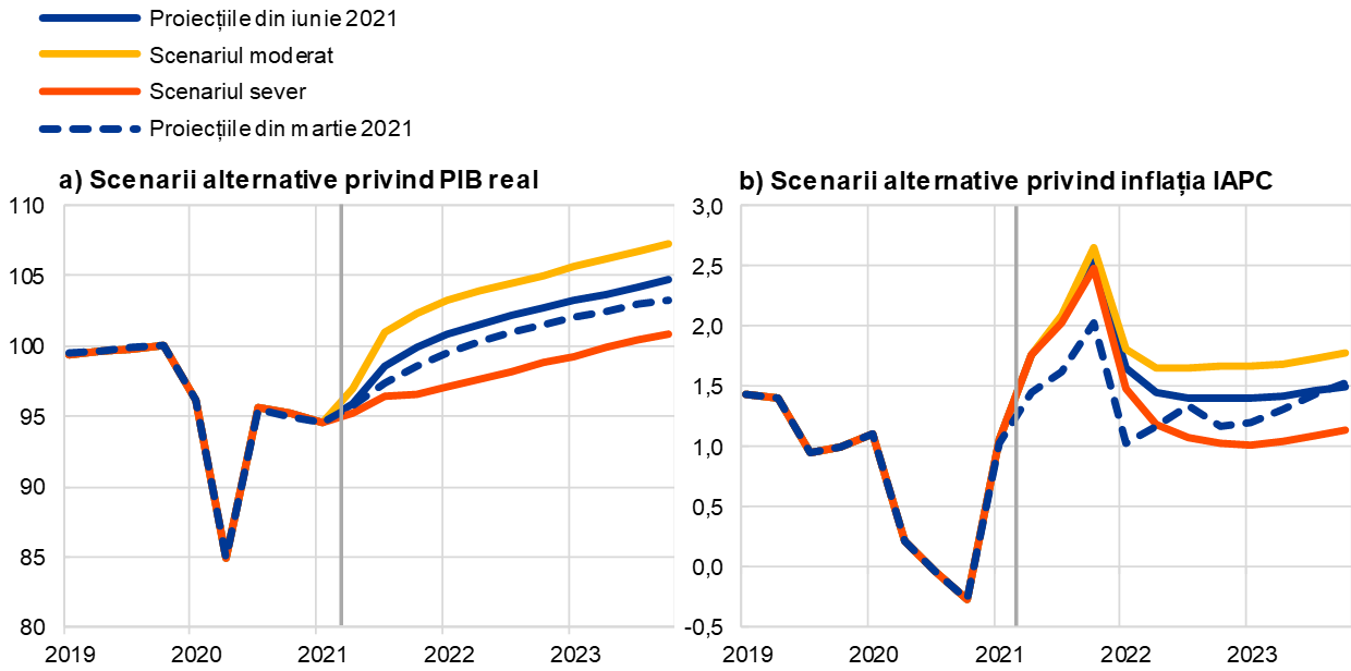 Întrucât persistă incertitudini semnificative cu privire la evoluția viitoare a pandemiei de COVID-19 și la efectele economice ale acesteia, două scenarii, care reprezintă alternative la proiecțiile de bază ale experților Eurosistemului din luna iunie 2021, ilustrează o serie de efecte plauzibile ale pandemiei de COVID-19 asupra economiei zonei euro.
