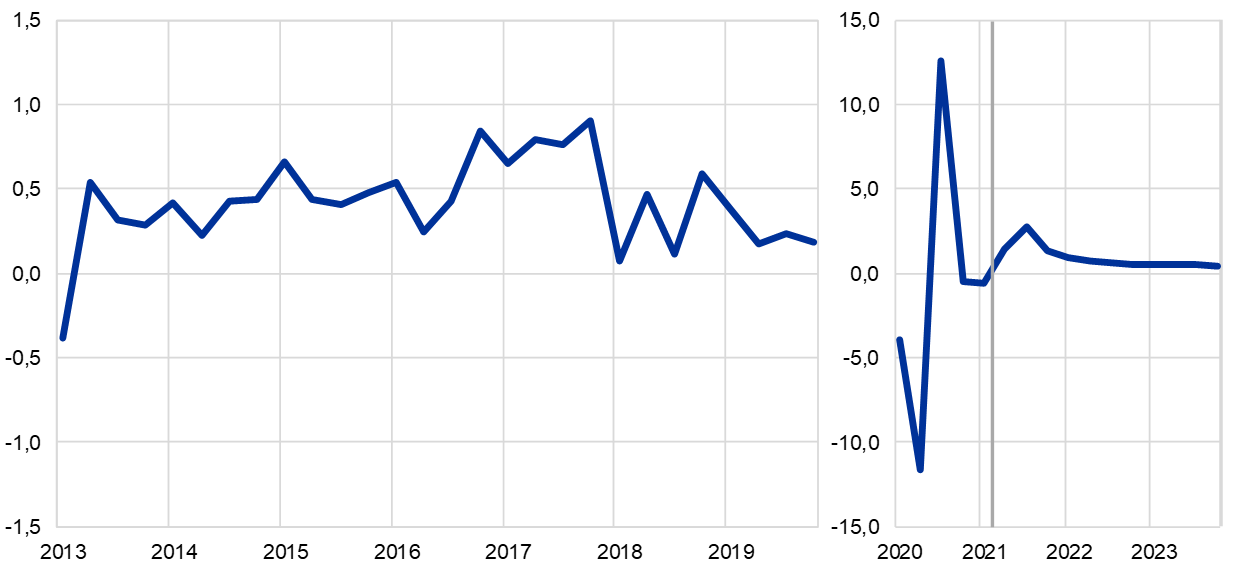 Notă: Linia verticală indică începutul orizontului de proiecție. Graficul nu prezintă intervalele din jurul proiecțiilor. Aceasta reflectă faptul că, în circumstanțele actuale, calculul standard al intervalelor (pe baza erorilor istorice de proiecție) nu ar oferi o indicație fiabilă a incertitudinilor ridicate care grevează proiecțiile actuale. În schimb, pentru a ilustra mai bine gradul actual de incertitudine, în Secțiunea 5 sunt prezentate scenarii alternative bazate pe ipoteze diferite privind evoluția viitoare a pandemiei de COVID-19, măsurile restrictive asociate și amploarea repercusiunilor economice.
