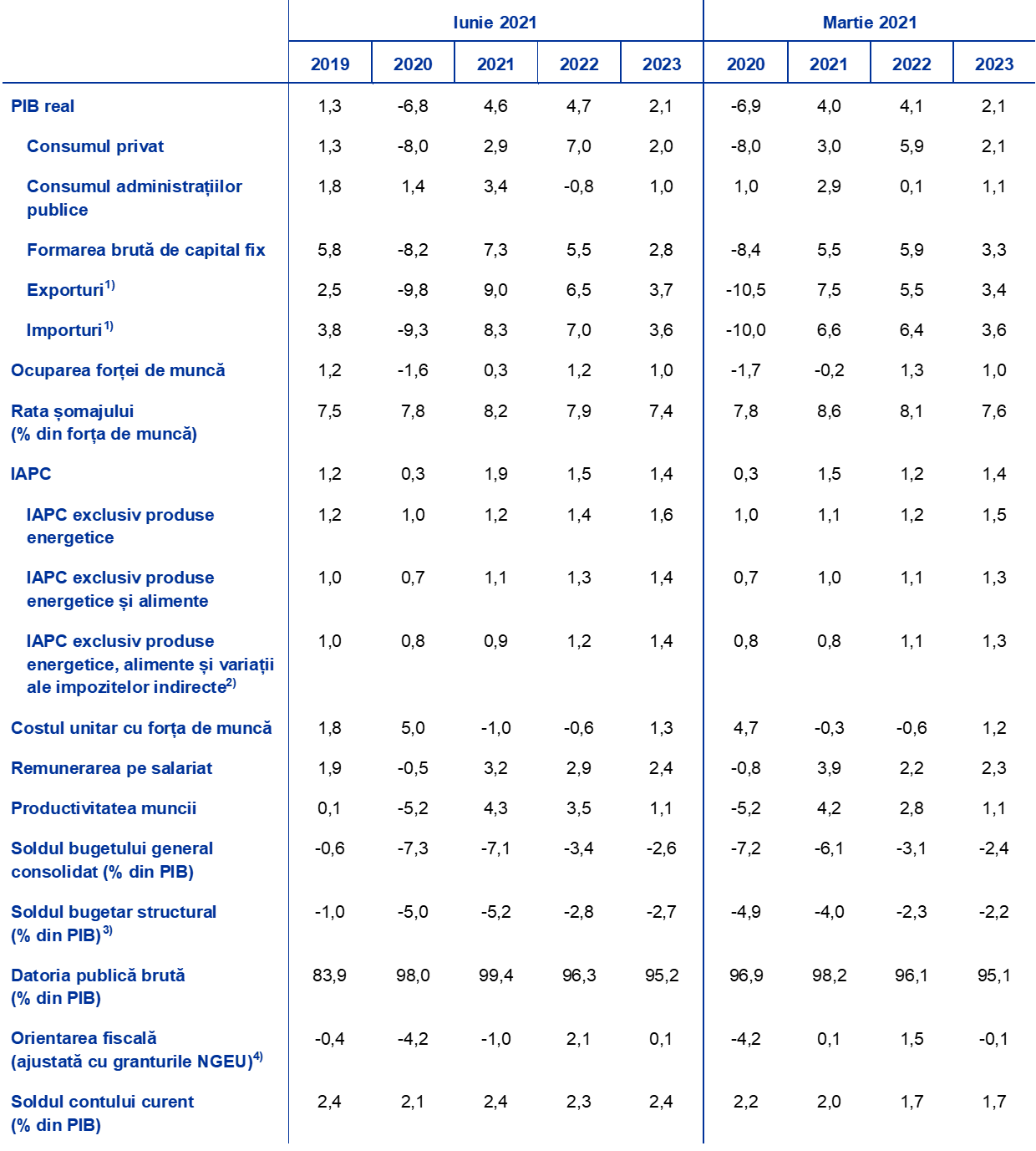 Notă: PIB real și componentele sale, costul unitar cu forța de muncă, remunerarea pe salariat și productivitatea muncii se referă la date ajustate sezonier și cu numărul zilelor lucrătoare. Datele istorice pot fi diferite de cele mai recente date publicate de Eurostat, având în vedere publicarea acestora după data-limită pentru proiecții. Tabelul nu prezintă intervalele din jurul proiecțiilor. Aceasta reflectă faptul că, în circumstanțele actuale, calculul standard al intervalelor (pe baza erorilor istorice de proiecție) nu ar oferi o indicație fiabilă a incertitudinilor ridicate care grevează proiecțiile actuale. În schimb, pentru a ilustra mai bine gradul actual de incertitudine, în Secțiunea 5 sunt prezentate scenarii alternative bazate pe ipoteze diferite privind evoluția viitoare a pandemiei de COVID-19, măsurile restrictive asociate și amploarea repercusiunilor economice.