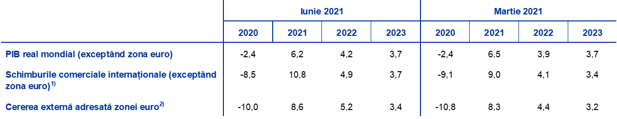 În pofida revizuirii în sens ascendent pentru Statele Unite, perspectivele creșterii economiei globale au cunoscut puține modificări comparativ cu proiecțiile din luna martie 2021, în timp ce proiecțiile privind schimburile comerciale internaționale s-au ameliorat într-o oarecare măsură. Se proiectează o expansiune a PIB mondial (exceptând zona euro) cu 6,2% anul acesta, urmată de o decelerare la 4,2% și 3,7% în 2022 și, respectiv, 2023. Această evoluție reflectă interacțiunea unor factori, inclusiv agravarea pandemiei în economiile dezvoltate la începutul acestui an și în economiile de piață emergente mai recent,[12] precum și impactul macroeconomic al stimulului fiscal amplu din Statele Unite și o îmbunătățire a perspectivelor în alte economii dezvoltate ca urmarea introducerii rapide a vaccinurilor. Deși, la sfârșitul anului 2020, activitatea globală a depășit nivelul din perioada pre-pandemie, se estimează că aceasta se va menține, pe parcursul orizontului de proiecție, sub traiectoria anticipată în proiecțiile experților din luna decembrie 2019.