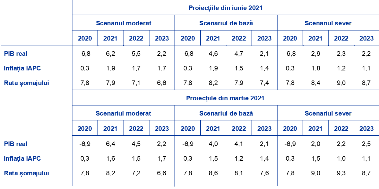 Comparativ cu proiecțiile din luna martie 2021, creșterea PIB real a fost revizuită în sens ascendent pentru anii 2021 și 2022. Dinamica pentru semestrul II 2021 a fost revizuită în sens ascendent, în special în trimestrul III. Aceasta reflectă anticipația privind o relaxare mai rapidă a măsurilor restrictive, legată de accelerarea progresului în ceea ce privește vaccinările, de sprijinul fiscal suplimentar și de reevaluarea impactului deblocării cererii interne reprimate asupra redeschiderii sectoarelor economice. Aceasta explică cea mai mare parte a revizuirilor creșterii anuale pentru 2021 și, în special, pentru 2022, acestea din urmă datorându-se în întregime unor efecte de report. Impactul ipotezelor este, în linii mari, neutru, deoarece efectele pozitive asupra creșterii, susținute de ipoteze privind o cerere externă mai robustă, sunt în mare măsură anulate de impactul negativ atât al creșterii prețurilor petrolului, cât și al inversării măsurilor de sprijin fiscal suplimentare, dar temporare, după anul curent.