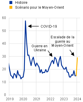 Cette analyse de scénario examine les risques extrêmes pesant sur les projections de référence de décembre 2023 et découlant d’une éventuelle nouvelle intensification du conflit au Moyen-Orient. Le scénario de référence des projections de décembre 2023 fait l’hypothèse que le conflit actuel sera contenu d’un point de vue géographique et qu’il ne devrait donc pas avoir de répercussions économiques significatives sur l’économie de la zone euro au-delà de celles déjà observées. La réaction des marchés financiers mondiaux après le déclenchement du conflit a été modérée, et accompagnée d’une légère hausse initiale des cours du pétrole et de l’incertitude économique, conformément aux liens commerciaux et financiers limités de la zone euro avec les zones concernées. Le scénario présenté dans cet encadré suppose une escalade importante et prolongée du conflit et une fermeture partielle du détroit d’Ormuz, avec des répercussions plus notables sur l’économie mondiale et la zone euro par rapport aux projections de référence de décembre 2023. Cela supposerait des perturbations de l’activité économique, en particulier pour les pays directement impliqués dans le conflit, ainsi qu’une hausse des prix des matières premières énergétiques, et une accentuation généralisée de l’incertitude économique et des turbulences sur les marchés financiers (cf. graphique A). Ce scénario est considéré comme un scénario de risque extrême et, compte tenu de la forte incertitude qui entoure l’évolution du conflit, les estimations doivent être considérées avec une grande prudence.