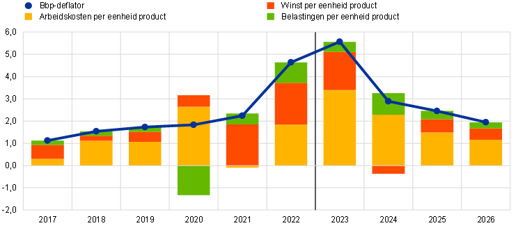 De HICPX-inflatie loopt gedurende de projectieperiode naar verwachting geleidelijk terug (Grafiek 7). Verwacht wordt dat de HICPX-inflatie daalt van 3,6% in november 2023 tot 2,7% in het vierde kwartaal van 2024 en vervolgens verder tot gemiddeld 2,3% en 2,1% in 2025 en 2026. Op korte termijn heeft de afnemende prijsdruk in het productieproces naar verwachting een sterk neerwaarts effect, terwijl de hogere arbeidskostendruk naar verwachting de HICPX-inflatie ondersteunt. Het verloop van de HICPX-inflatie gedurende de gehele projectieperiode weerspiegelt de wegebbende effecten van eerdere druk op het productieproces en knelpunten aan de aanbodzijde, de normalisering van de vraag na de heropeningseffecten in verband met de pandemie en de verkrapping van het monetair beleid door de ECB. Een snellere daling van de HICPX-inflatie tijdens de projectieperiode wordt belemmerd door de afnemende, maar nog steeds hoge opwaartse druk van de arbeidskosten, die slechts ten dele wordt opgevangen door de winst per eenheid product.