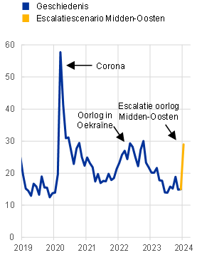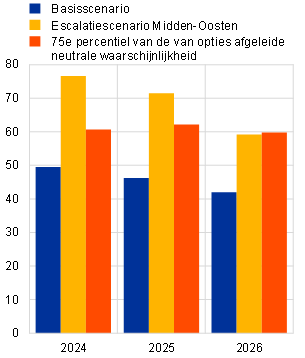 Een hypothetische escalatie van het conflict zou tot forse stijgingen van de olie- en gasprijzen kunnen leiden, met name bij een gedeeltelijke blokkade van de Straat van Hormuz. In het scenario wordt ervan uitgegaan dat ongeveer een derde van de olie- en gastransporten via de Straat van Hormuz wordt verstoord, wat bijdraagt tot een verkrapping op de mondiale energiemarkten. Daardoor zouden de olieprijzen in het tweede kwartaal van 2024 stijgen tot bijna $ 130 per vat en zouden de gasprijzen stijgen tot € 83 per MWh (respectievelijk 57% en 74% boven de aannames in de basisprojecties). Al met al wordt aangenomen dat een synthetische energieprijsindex (die olie- en gasprijzen combineert) in het tweede kwartaal van 2024 64% boven het basisscenario uitkomt en in 2026 36% boven het basisscenario blijft (Grafiek A, paneel a). Dit scenario is extreem omdat het de energieprijzen zou opdrijven tot boven het 75e percentiel van de van opties afgeleide verdeling voor energiefutures (zie ook Kader 4). De Straat van Hormuz is nog nooit echt geblokkeerd geweest, en ook de veronderstelde schok in het olie- en gasaanbod is hardnekkiger dan historische aanbodschokken, omdat het evenwicht op de energiemarkten zich doorgaans vrij snel herstelt.