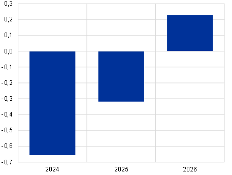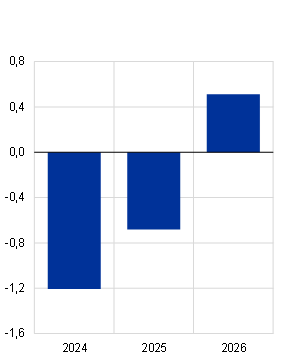 Op middellange termijn stabiliseert de bbp-groei zich naar verwachting op een niveau dat grotendeels in overeenstemming is met het gemiddelde van vóór de pandemie, ondersteund door stijgende reële inkomens en een aantrekkende buitenlandse vraag. De reële bbp-groei trekt gedurende 2024-2025 aan en stabiliseert zich vervolgens in 2026 (Tabel 2). Hoewel de recente gunstige factoren afnemen, wordt de groei volgens de projecties gestimuleerd door afnemende inflatoire druk, geholpen door het wegebben van de energieschok, en een robuuste inkomensgroei. Tegen de achtergrond van veerkrachtige arbeidsmarkten zorgen deze factoren voor een sterk herstel van de particuliere consumptie. Niettemin zal het stopzetten van de sinds 2022 ingevoerde compenserende budgettaire steunmaatregelen voor energie en inflatie een klein negatief effect hebben op de groei in 2024-2026.