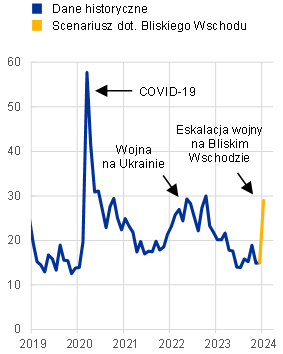 W niniejszej analizie zbadano skrajne czynniki ryzyka dla scenariusza bazowego projekcji z grudnia 2023 wynikające z potencjalnej dalszej eskalacji konfliktu na Bliskim Wschodzie. W scenariuszu bazowym projekcji z grudnia 2023 założono, że obecny konflikt będzie miał ograniczony zasięg geograficzny i w związku z tym nie wpłynie istotnie na gospodarkę strefy euro – w stopniu większym, niż dotychczas zaobserwowano. Reakcja światowych rynków finansowych po wybuchu konfliktu była łagodna i początkowo obejmowała niewielki wzrost cen ropy i niepewności gospodarczej, co odpowiadało ograniczonemu zakresowi powiązań handlowych i finansowych strefy euro z obszarami objętymi konfliktem. W scenariuszu analizowanym w niniejszej ramce założono znaczną i długotrwałą eskalację konfliktu oraz częściowe zamknięcie cieśniny Ormuz, co przyniosłoby poważniejsze konsekwencje dla gospodarki światowej i strefy euro względem scenariusza bazowego projekcji z grudnia 2023. Oznaczałoby to zakłócenia w aktywności gospodarczej, szczególnie w krajach bezpośrednio zaangażowanych w konflikt, a także wyższe ceny surowców energetycznych oraz wzrost ogólnej niepewności gospodarczej i zaburzenia na rynkach finansowych (wykres A). Taki scenariusz uważa się za skrajny, a biorąc pod uwagę wysoką niepewność co do rozwoju konfliktu, szacunki należy traktować z dużą ostrożnością.