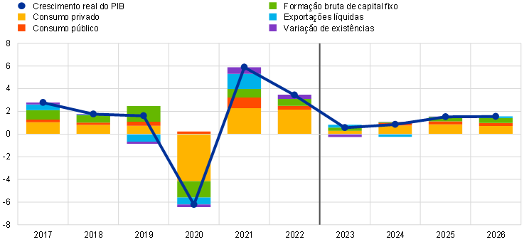 No que respeita às componentes do PIB real, espera‑se que o consumo privado real registe uma recuperação gradual e apoie o crescimento económico, com a descida da incerteza e da inflação e a melhoria dos rendimentos reais e da confiança. O consumo privado estagnou no primeiro semestre do ano, face à contração da despesa em bens, enquanto a despesa em serviços de consumo se manteve resiliente. Refletindo a descida da inflação e os efeitos ainda persistentes da reabertura da economia após a pandemia, aliados a uma ligeira recuperação da confiança em novembro, estima‑se que as despesas de consumo tenham registado um fortalecimento no segundo semestre do ano. Para além do curto prazo, com a descida da inflação e da incerteza e a melhoria dos rendimentos reais, caso não se verifiquem quaisquer choques adversos adicionais, o consumo deverá continuar a melhorar e a apoiar o crescimento económico, não obstante o desvanecimento dos efeitos da reabertura da economia. O crescimento do consumo das famílias deverá manter‑se robusto em 2026, apoiado por aumentos dos rendimentos do trabalho e não relacionados com o trabalho e pela diminuição de anteriores motivos de precaução. O crescimento do consumo privado foi revisto em alta em 0,2 pontos percentuais para 2023, em comparação com as projeções de setembro de 2023, devido a revisões de dados em sentido ascendente para o primeiro semestre do ano, mas foi revisto em baixa em 0,2 pontos percentuais para 2024, em virtude da poupança mais elevada no curto prazo, e permanece inalterado para 2025.