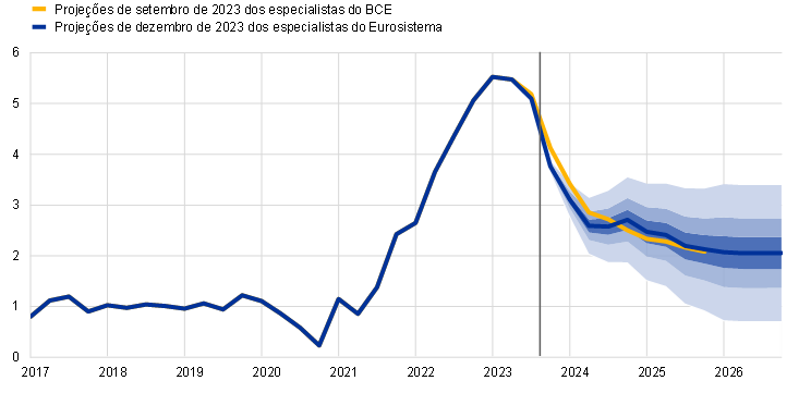 | Projeções dos especialistas do Eurosistema | Dezembro de 2023 | 0,8 | 1,5 | 1,5 | 2,7 | 2,1 | 1,9 |