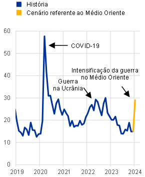 Esta análise de cenários centra‑se nos riscos extremos, para as projeções de referência de dezembro de 2023, decorrentes de uma potencial intensificação do conflito no Médio Oriente. As projeções de referência de dezembro de 2023 pressupõem que o atual conflito será contido em termos geográficos e, por conseguinte, não tenha efeitos económicos significativos na economia da área do euro para além dos já observados. A reação dos mercados financeiros mundiais após a eclosão do conflito foi comedida, com um modesto aumento inicial dos preços do petróleo e da incerteza económica, em conformidade com as limitadas ligações comerciais e financeiras da área do euro com as regiões afetadas. O cenário considerado na presente caixa pressupõe uma intensificação significativa e prolongada do conflito e um encerramento parcial do estreito de Ormuz, o que implicaria repercussões mais fortes para a economia mundial e a área do euro em comparação com as projeções de referência de dezembro de 2023. Tal levaria a perturbações da atividade económica, em particular nos países diretamente envolvidos no conflito, assim como a preços mais elevados das matérias‑primas energéticas e a um aumento da incerteza económica em geral e das perturbações nos mercados financeiros (gráfico A). Um cenário desta natureza é considerado um cenário de risco extremo e, dada a elevada incerteza quanto à evolução do conflito, as estimativas devem ser tratadas com grande cautela.