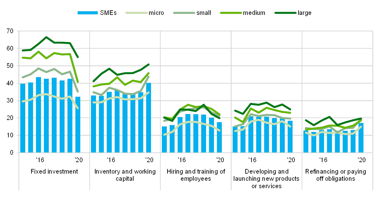 The sharp decline in economic activity and profits also took a heavy toll on firms’ investment and hiring decisions. On balance, euro area SMEs reported a decline in fixed investments (-10%, down from 12%), inventories and working capital (-15%, from 1%) and number of employees (-10%, from 5%) – in all cases, for the first time in recent years. These negative dynamics applied to firms in all size categories.