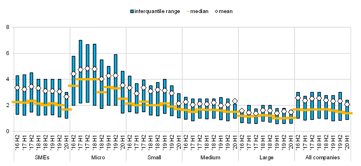 11. From round 11 (April-September 2014), the question regarding the interest rate of the credit line or bank overdraft was added to the questionnaire. The weighted mean reported by euro area enterprises (2.07%) is 16 basis points higher than the official monetary financial institutions’ interest rate statistics on bank overdrafts (average in the period from April-September 2020), while the median value (1.39%) is 53 basis points lower. Two caveats apply when comparing the figures quoted in this report with the official bank interest rate statistics: (i) the bank statistics are weighted by the loan volumes, while the survey responses are weighted by the number of employees; and (ii) the bank statistics refer to the full financing granted in the period, while the survey includes all enterprises that had successfully applied for the credit line or bank overdraft or did not apply because the cost was too high.