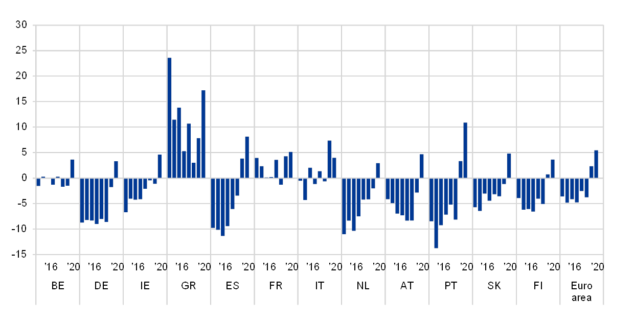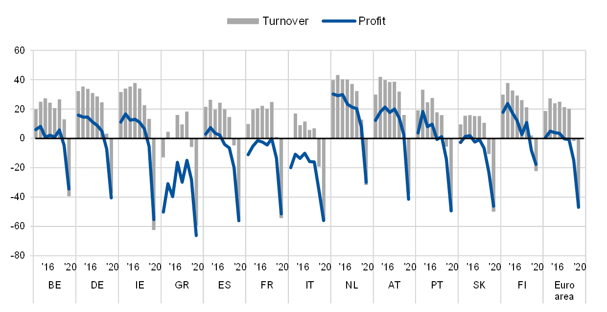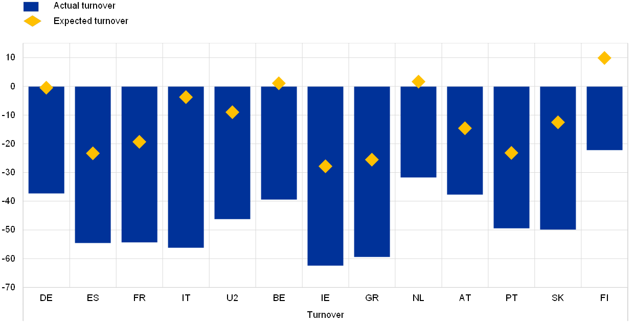 Expectations regarding turnover suggest that the COVID-19 pandemic will have a lasting effect on business activity. The net percentage figure (-9%) indicates that, on balance, euro area enterprises foresee a continued decrease in turnover during the next six months (see Chart 28 ) – although the number of SMEs expecting a further decline in turnover is lower than the number of enterprises that reported an actual decline over the past six months (-46%). Survey results also indicated some heterogeneity in the expected speed of recovery among countries. In Belgium (1%), the Netherlands (2%) and particularly in Finland (10%), higher turnover is already expected, on balance, over the next six months, while in Germany (-1%) and Italy (-4%) expectations suggest relatively mild declines. By contrast, the expectations of firms in Ireland (-28%), Greece (-26%), Spain and Portugal (-23% in both cases) clearly indicate a continued decrease in turnover, suggesting that there will be no recovery in business activity in those countries over the next six months.