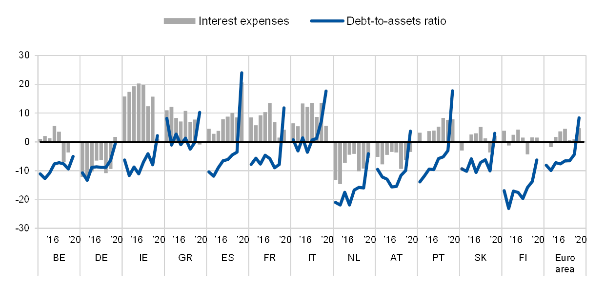 Change in debt-to-assets ratio and interest expenses of SMEs across euro area countries