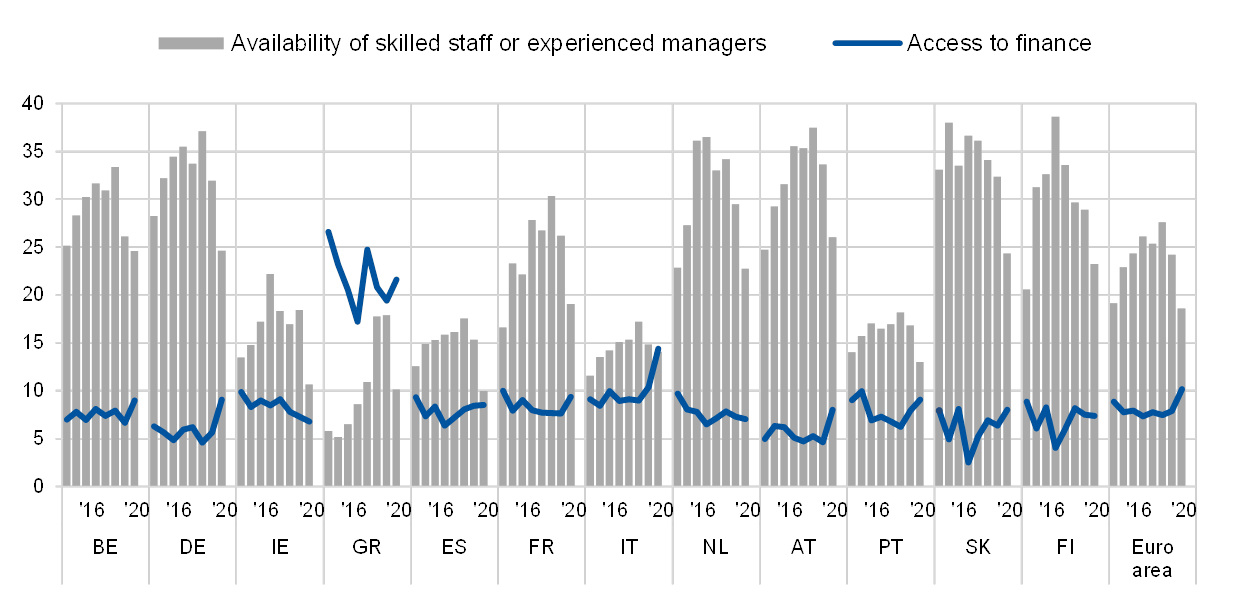 In the middle of the coronavirus (COVID-19) pandemic, euro area SMEs reported that difficulty in finding customers was the dominant concern for their business activity, while access to finance was considered to be among the least important obstacles. As in previous editions, the 23rd round of the Survey on the Access to Finance of Enterprises (SAFE) in the euro area asked entrepreneurs to indicate the most pressing problem facing their company. Difficulty in finding customers was considered the key concern for euro area SMEs (22%), followed by a lack of availability of skilled labour (19%). Concerns about access to finance rose in most countries. However, while lack of access to finance continued to have a strong impact on SMEs in Greece (22%) and Italy (14%), it remained among the least important obstacles in the euro area as a whole (10%). Other factors that relatively few SMEs saw as a major concern were competition (9%), costs of production and the regulatory burden (both 11%).