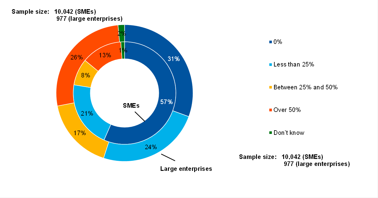 For the second year in a row, the survey also asked SMEs about the extent to which they perceived late payments[7] as a problem, and what impact late payments have on their business activity. In this survey round, 12% of euro area enterprises (both SMEs and large companies) signalled that they experienced problems on a regular basis as a result of late payments from private and/or public entities. Meanwhile, 31% of SMEs mentioned that these problems occurred occasionally in the last six months. These numbers imply just a marginal decrease for regular problems (13%) compared with last year’s replies and a decrease by the same percentage for occasional ones. The frequency of regular problems with late payments over the last six months is the same for SMEs as for large companies. However, the percentage of large firms experiencing occasional late payments has increased to 37% over the past six months (from 30% last year), which suggests that larger firms may have been more affected this year by disruptions resulting from the COVID-19 pandemic owing to their supposedly wider business networks.