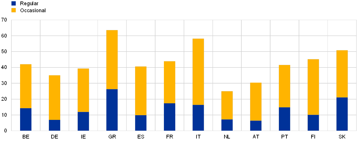 Turning to the situation across euro area countries, late payments are a regular problem for a relatively high proportion of firms in Greece and Slovakia (26% and 21% respectively), but also in France (17%) and Italy (16%) among the four largest countries (see Chart D). Occasional late payments have been more frequent in Greece and Italy. Overall, SMEs in the Netherlands and Austria have been the least affected by late payments over the last six months.
