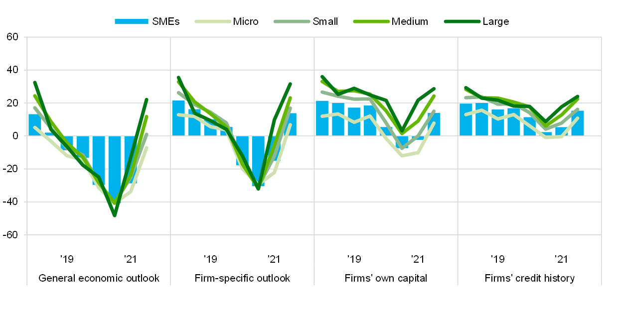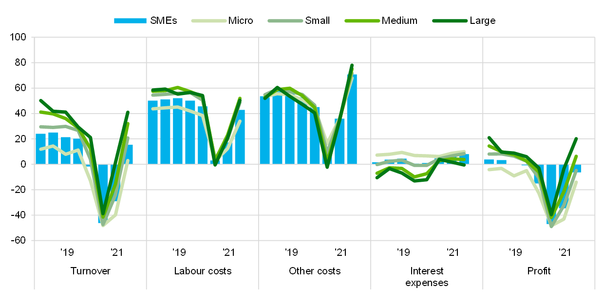 Consequently, a significant proportion of euro area SMEs continued to report a deterioration in profits, albeit less so than in the previous round (-6%, up from -35%). However, there were important differences in profits across firm sizes, with a positive net percentage of large companies and medium-sized SMEs reporting an increase in profits (20% and 6% respectively), while small and micro SMEs continued, in net terms, to show decreases in profits (-5% and -14% respectively).