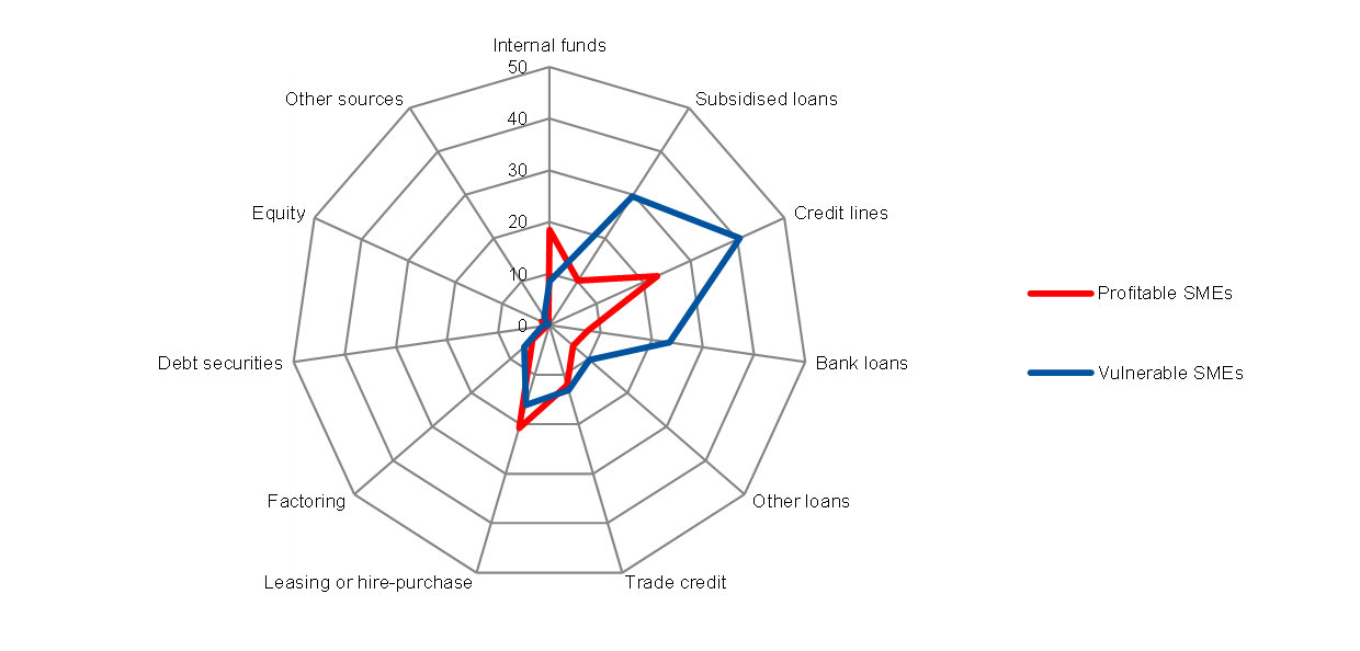5. Vulnerable firms are defined as firms that simultaneously report lower turnover, decreasing profits, higher interest expenses and a higher or unchanged debt-to-assets ratio, while profitable firms are those that simultaneously report higher turnover and profits, lower or no interest expenses and a lower or no debt-to-assets ratio. The third (and typically largest) group consists of firms that satisfy some, but not all, conditions of the vulnerable and profitable categories. See the box entitled “Distressed and profitable firms: two new indicators on the financial position of enterprises”, Survey on the Access to Finance of Enterprises in the euro area, October 2017 to March 2018, ECB.