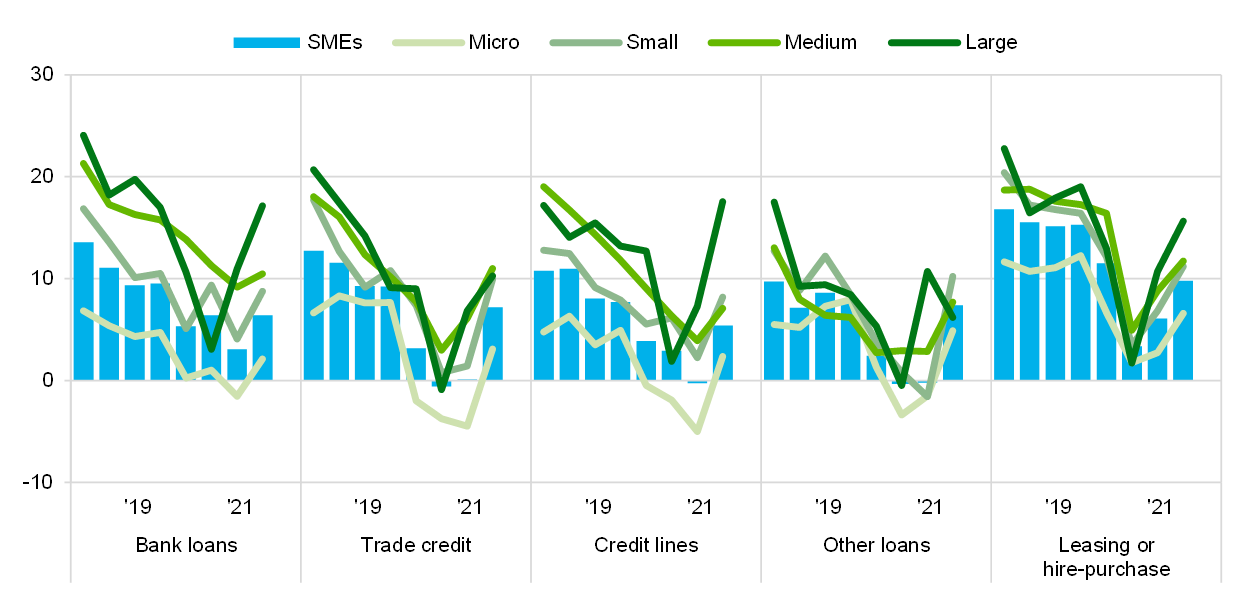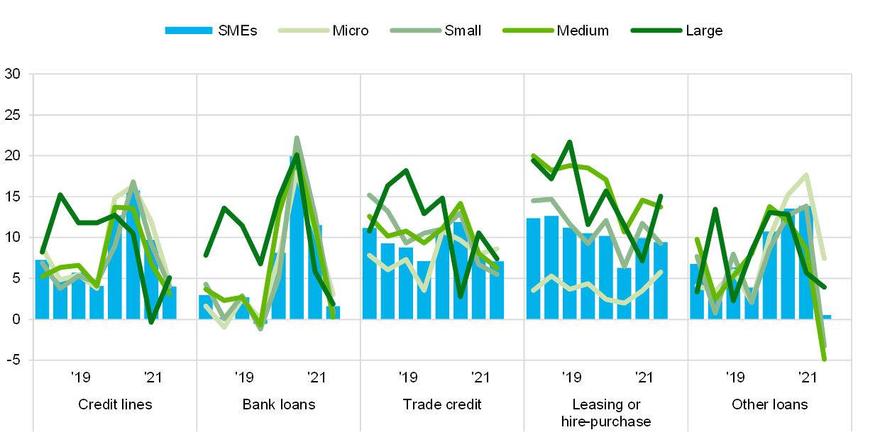 Overall, the availability of bank loans continued to rise slightly across all classes of firm size and countries. The net percentage of SMEs reporting an improvement in the availability of bank loans increased from 3% to 6% (see Table 1, column 6). Firms across all size groups, with the exception of medium-sized firms, pointed to a return to pre-COVID 19 levels of bank loan availability. The increase was broad-based across countries, although SMEs in Belgium reported reductions in the availability of bank loans. SMEs also indicated, on balance, an increase in the supply of credit lines to 5% (up from 0%) and a rise in trade credit to 7% (up from 0%).