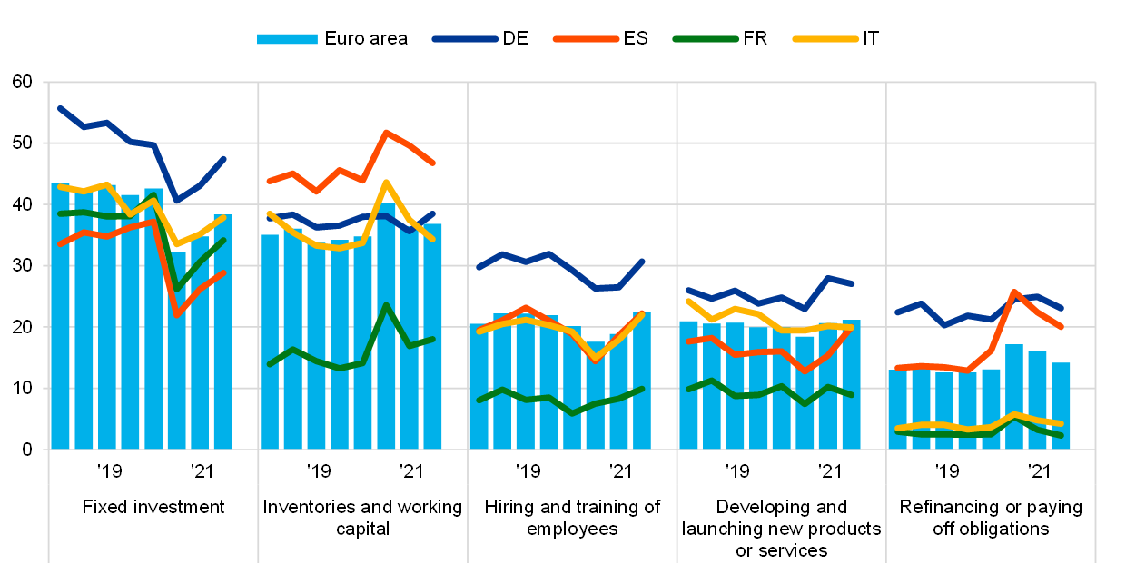 Moreover, SMEs in all large countries reported, in net terms, a rise in inventories and working capital expenses, as well as in employment and fixed investment. In net terms, 5% of euro area SMEs reported an increase in inventories and working capital expenses (with net percentages ranging from 1% to 8% across the four largest countries), 7% reported a rise in employment (with net percentages ranging from 5% to 9%), and 11% reported increases in fixed investment (ranging between 6% and 15% in the four largest euro area economies).