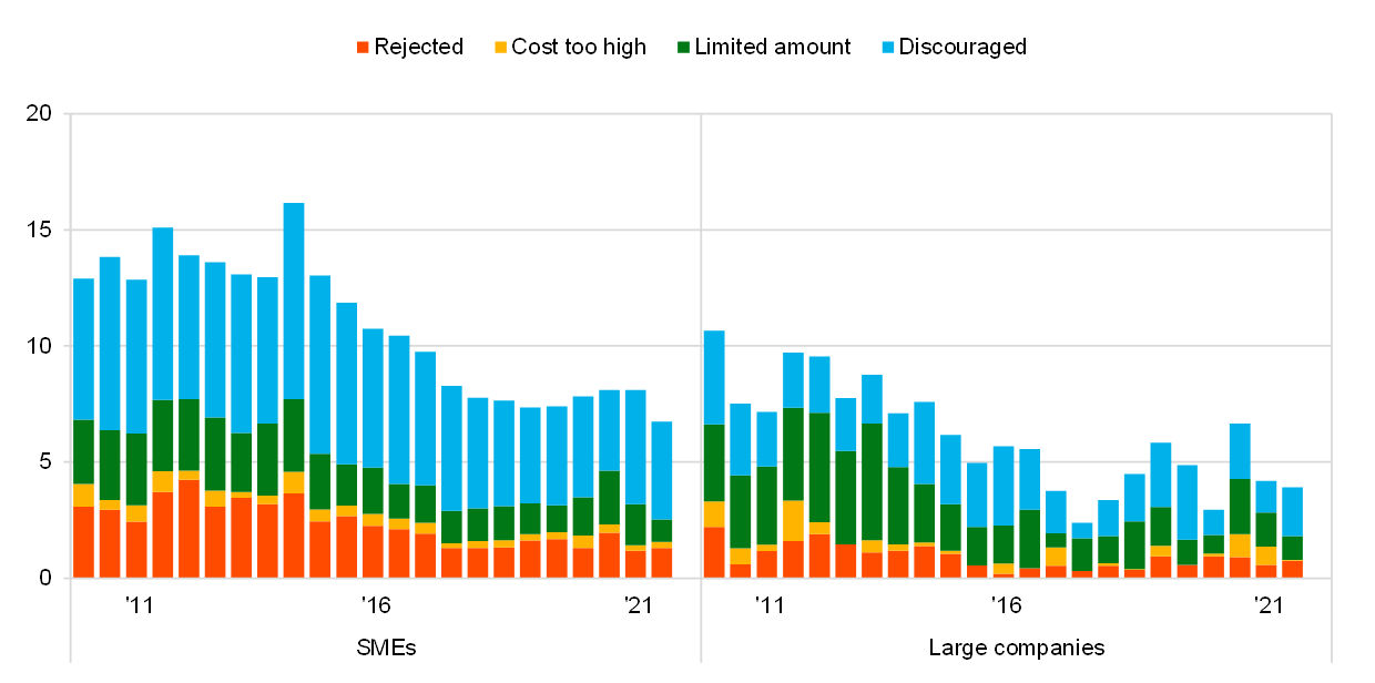 3. The financing obstacles indicator is the sum of the percentages of SMEs reporting the rejection of loan applications, loan applications for which only a limited amount was granted, and loan applications which resulted in an offer that was declined by the SME because the borrowing costs were too high, as well as the percentage of SMEs that did not apply for a loan for fear of rejection.
