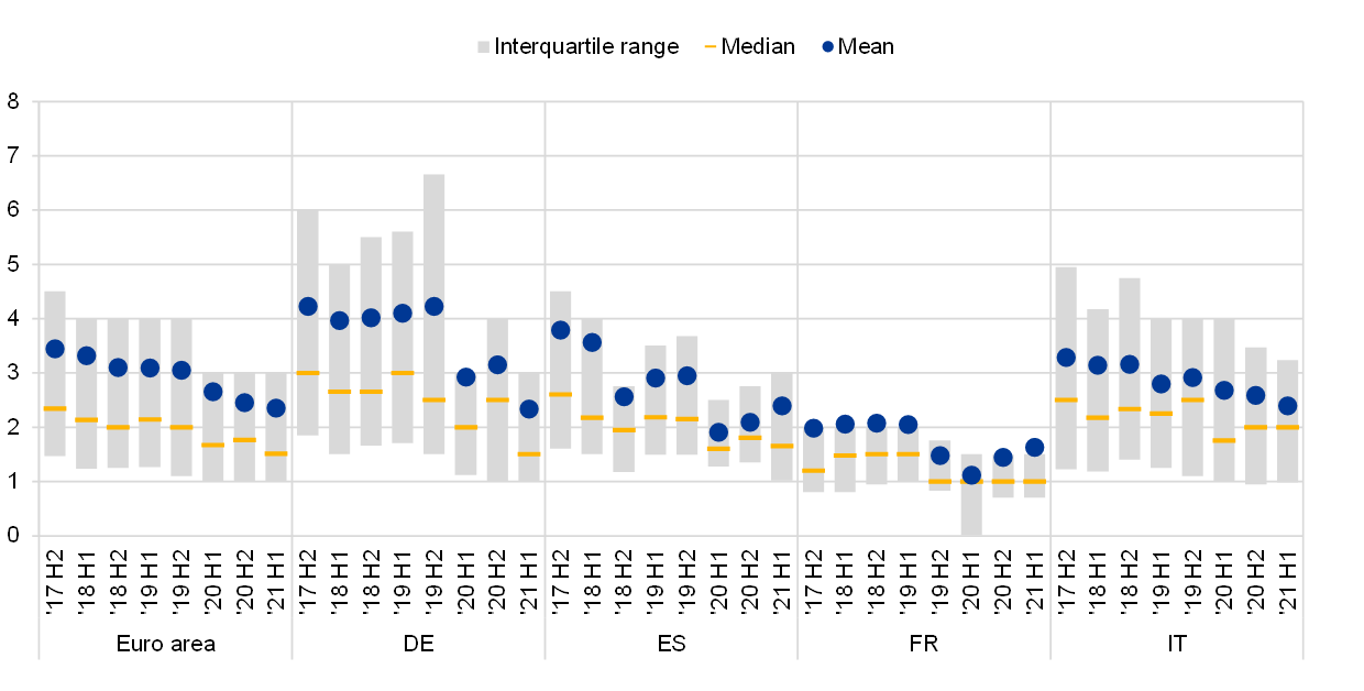 11. The weighted mean and median values reported by euro area enterprises (1.6% and 1% respectively) is 17 and 78 basis points lower than the official MFI interest rate statistics on bank overdrafts (the average for the period from April to September 2021). Two caveats apply when comparing the figures quoted in this report with official bank interest rate statistics: (i) the bank statistics are weighted by loan volumes, whereas the survey responses are weighted by the number of employees; and (ii) the bank statistics refer to all financing granted in the review period, whereas the survey responses only include enterprises that successfully applied for a credit line or bank overdraft or applied, but didn’t accept the terms that were offered to them (for example, because the rate was too high).