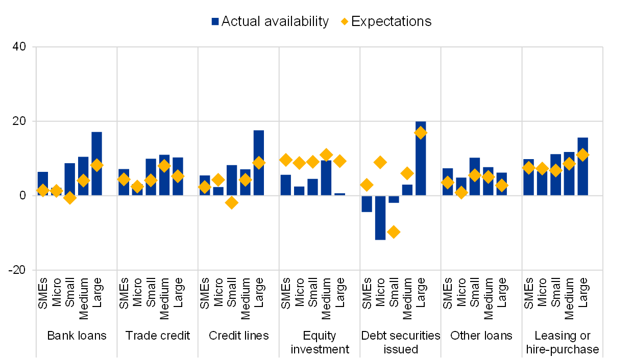 Larger enterprises tended to be more optimistic in their expectations for most sources of external financing. For example, large firms expected, in net terms, to see an improvement in their access to most sources of external financing in the months ahead, whereas expectations for improvements appeared to be more limited among SMEs.