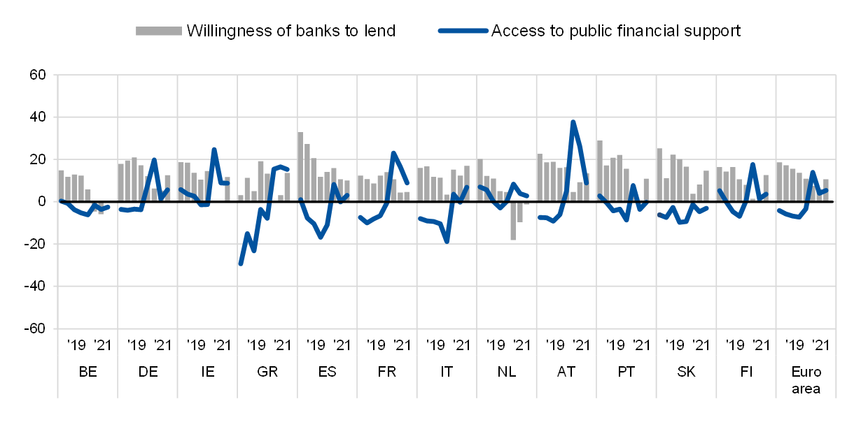 Base: All SMEs; for the category “willingness of banks to lend”, SMEs for which at least one bank financing instrument (credit line, bank overdraft, credit card overdraft, bank loan or subsidised bank loan) is relevant. The figures refer to rounds 18-25 of the survey (October 2017-March 2018 to April 2021-September 2021).