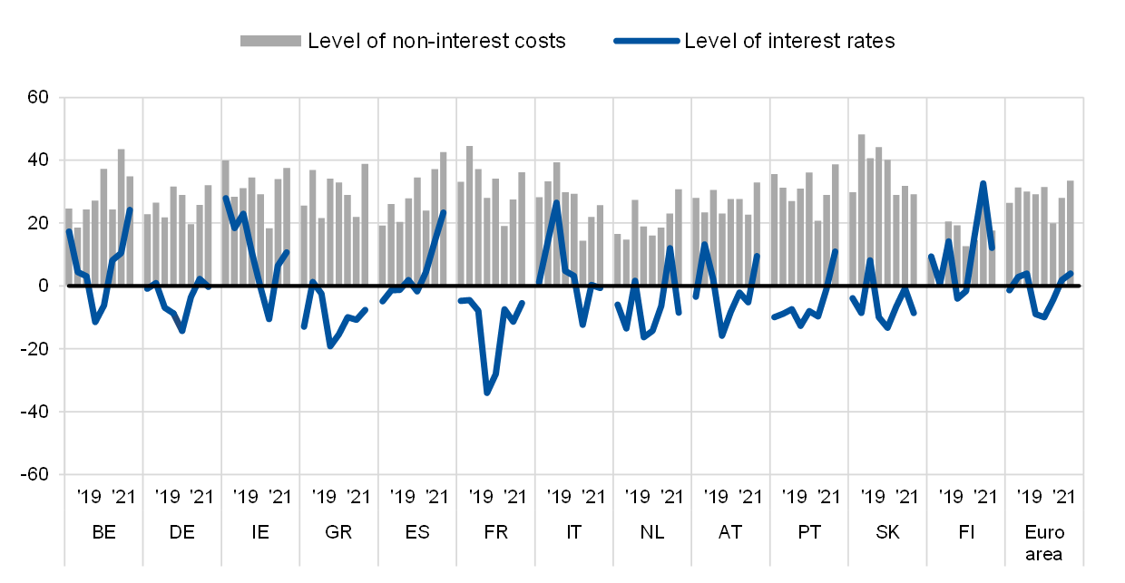 At the same time, euro area enterprises also reported significant increases in labour and other costs (i.e. for materials and energy). A larger net proportion of euro area SMEs reported increases in labour costs (43%, up from 17%) and other costs (71%, up from 36%), with increases being reported for all firm sizes. In contrast, larger firms did not report, in net terms, increases in interest rate expenses, while the percentage of SMEs reporting them rose marginally.